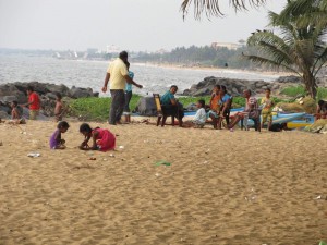 Místní se schází na pláži. Děti si hrají v nepořádku.