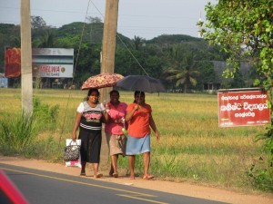 Místní ženy. Místo slunečníků využívají deštníky.
