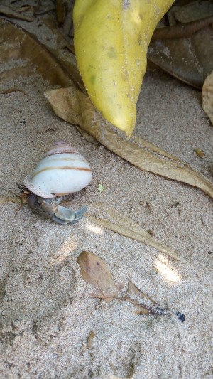 Na našem ležícím místečku byli krabíci a z mušličky si udělali byt :) Když jsem si fotila jednoho mrňouse, který se mi schovával, tak jsem odhrnula keřík a co nevidím. Velkého ZABIJÁKA! Což je velký krab s velkou mušlí. Asi jejich kápo. Jelikož jsem si ho chtěla zaznamenat do fotoaparátu, tak jsem ho vzala do ruky. Neublížil mi, asi měl větší strach než já.